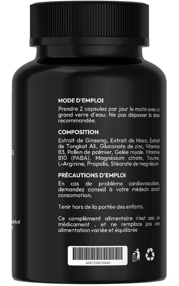 مستخلص الجنسنغ · مستخلص الماكا · مستخلص تونكات علي · جلوكونات الزنك · فيتامين ب3 · لقاح النخيل · غذاء الملكة · فيتامين ب10 (PABA) · سترات المغنيسيوم · التورين · إل-أرجينين · البروبوليس · ستيرات المغنيسيوم
